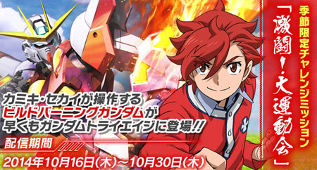 季節限定チャレンジミッション「激闘!大運動会」は、“スポーツの秋”にちなんで配信される、記念すべき「BUILD G」弾初のチャレンジミッションで、好評放送中の『ガンダムビルドファイターズトライ』の主人公カミキ・セカイが操作する「ビルドバーニングガンダム」が早くも登場。