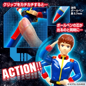 『機動戦士ガンダム』に登場するモビルスーツや人物をモチーフにした“動く”ボールペン「アクションペン」が登場。クリップを押した際に敬礼する「アムロ・レイ」、「シャア・アズナブル」や、手足が出現する「ハロ」、モノアイが高速可動する「シャア専用ザク」、開閉するシャア専用ズゴックの「アイアン・ネイル」の全5種がラインナップされている。