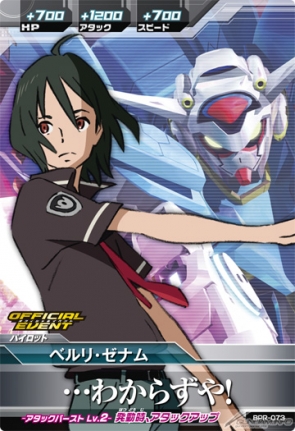 「トライエイジトーナメント12月大会」では、最大16人によるトーナメント大会が実施され、見事優勝すると先月に引き続きトーナメントオリジナルカラーの「アストレイ ブルーフレーム セカンドL(プラチナカラー)」が開発可能となる。また、参加希望者へはプロモーションカード「BPR-073 ベルリ・ゼナム」が、さらに、参加者へは「スペシャルカードパック10」がプレゼントされる。