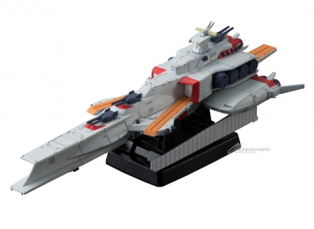 全長約170mmのシャープでリアルな艦体には、4基の「2連装メガ粒子砲」が装備され、各砲塔には旋回ギミックが搭載されている。さらに、左右のMS格納庫はパーツの差し替えによりハッチの開閉を再現可能となっている。