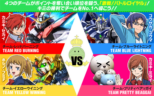 「激戦!バトルロイヤル」では、「チーム・レッドバーニング」、「チーム・ブルーライトニング」、「チーム・イエローウイニング」、「チーム・プリティベアッガイ」の4つからランダムで自身の所属チームが決定され、No.1を目指すこととなる。