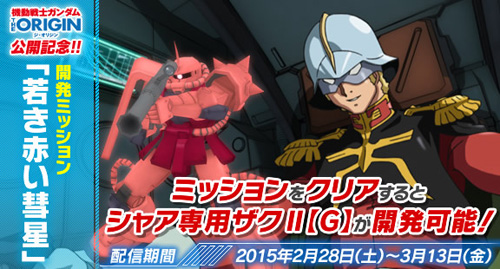 Take on a squadron of Zaku IIs lead by Char Aznable in his own custom mobile suit. Complete the mission, and you'll unlock the "Char's Zaku II [G]" in Build MS mode. The mission will be available through March 13th.