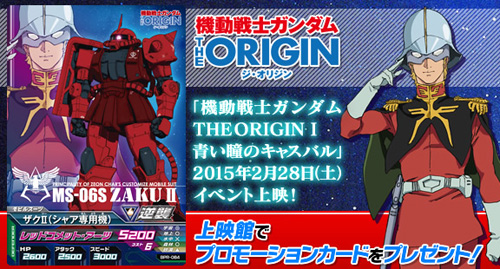 "BPR-084 Zaku II (Char's)" promo cards will be given away at the 13 theaters screening Mobile Suit Gundam The Origin I: Blue-Eyed Casval. Try out The Origin in TryAge before anyone else!