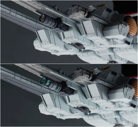 All of the original model's features are carried over, including the swappable hull-mounted hyper mega particle cannon and opening MS hangar doors.