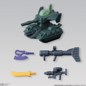 The second set includes the Char's Zaku, Zaku, Gouf, Dom, and Magella Attack & Zeon Weapons Set from Mobile Suit Gundam. The Magella Attack can be used as a weapon by the Zaku, and the tank portion can also combine with Zaku parts.