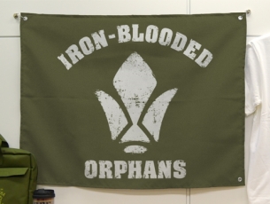 「鉄華団の旗」は、「鉄華団」のエンブレムがプリントされた旗。デザインにかすれ処理がほどこされ、ミリタリー感あふれるアイテムとなっている。四隅にハトメが付いているので、壁などにも簡単に飾ることが可能。