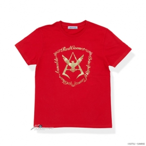 シャアのパーソナルマークを前面にプリントしたマーク柄と、「勝利の栄光を君に!」の英字台詞が前面に、背面にマークがプリントされた台詞柄の2種類を用意。いずれも金箔プリントで、ゴージャスな存在感のTシャツとなっている。