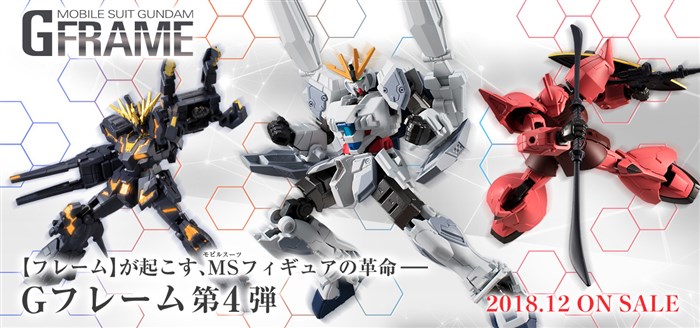"Mobile Suit Gundam GFrame" Série 4 avec des fonctionnalités comme armure-des cadres pouvant être attachés à la figure de Gundam hautement détaillée seront publiées aujourd'hui, Le 24 décembre, 2018 (Lun.) dans les magasins de jouets, magasins de détail électroniques pour la maison, et magasins en ligne. Prix est ¥ 500 chaque (taxe exc)
