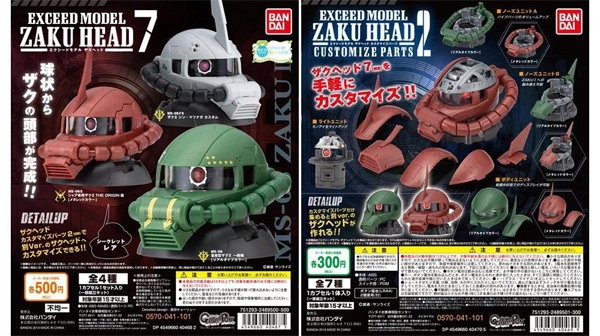 le "ZAKU TÊTE 7" et "Personnaliser les pièces 2" qui apparaissent dans le "Mobile Suit Gundam EXCEED MODEL" série, avec l'assemblage de précision dans une forme sphérique du kit de modèle de tête, sera publié à l'échelle nationale dans les magasins de jouets et les détaillants du marché de masse avec des distributeurs automatiques capsule à partir de la première semaine d'Octobre 2019.