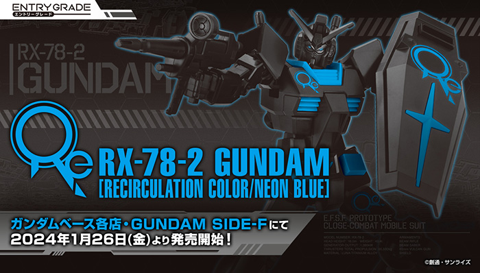 Le ENTRY GRADE 1/144 RX-78-2 Gundam apparaît avec une couleur spéciale [Recirculation Color / Neon Blue]. L’élégante « Recirculation Color » est une combinaison de matériaux recyclés noirs (ECOPLA) et de matériaux bleu fluo vifs, symbolisant un avenir cyclique.