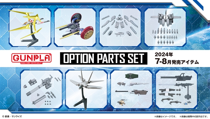 Un total de huit Option Parts Set GUNPLA (05 à 12), qui peut être utilisé pour personnaliser des articles vendus séparément, sera publié séquentiellement en juillet et août.
