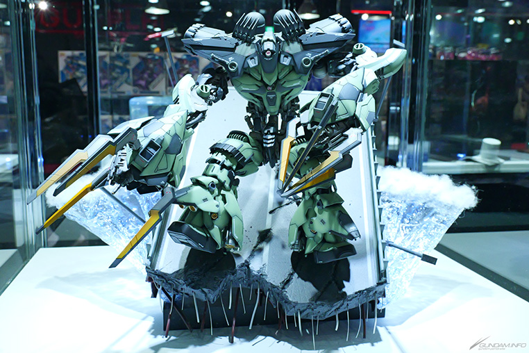 Commentaire : La réalisation de cette pièce a dû être difficile puisqu’elle est basée sur une scène emblématique qui représente les Sazabi. Cependant, le GUNPLA principal de ce chef-d’œuvre a été soigneusement conçu, et le hangar environnant et les effets de lumière sont stupéfiants. Le hangar est éclairé par le haut avec des lumières LED, et sa conception permet à la lumière d’entrer de l’extérieur pour créer un affichage global efficace.