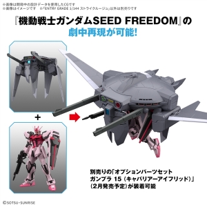 Il peut être combiné avec leOption Pièces Set Gunpla 15 (Cavalier Aifrid) (vendu séparément / sortie prévue en février) pour recréer des scènes de Mobile Suit Gundam SEED FREEDOM, et peut également être équipé duJeu de pièces optionnelles Gunpla 01 (Aile Striker) (également vendu séparément).