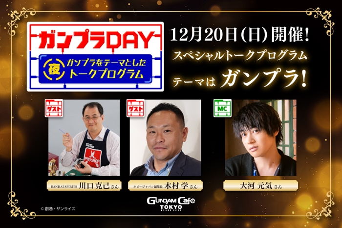 Une session Talk intitulée «parlons de quelques Gundam grub !GUNPLA "se tiendra pendant la période de dîner.éseau domestique Gundam grub ! GUNPLA "se tiendra pendant la période de dîner. L’acteur de voix Genki Ookawa servira de MC, avec Meijin Kawaguchi et des modèles de modèle « magazine loisir Japan »modèle de rédacteur en chef du magazine à thème Gaku Kimura participent également en tant qu’invités. Comme Kawaguchi et Kimura ont une expérience approfondie en tête des lignes frontales du GUNPLA WO