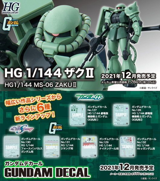 La sortie des décalcomanies HG Zaku II et six Gundam en décembre 2021 a été révélée sur le site de Bandai hobby.
