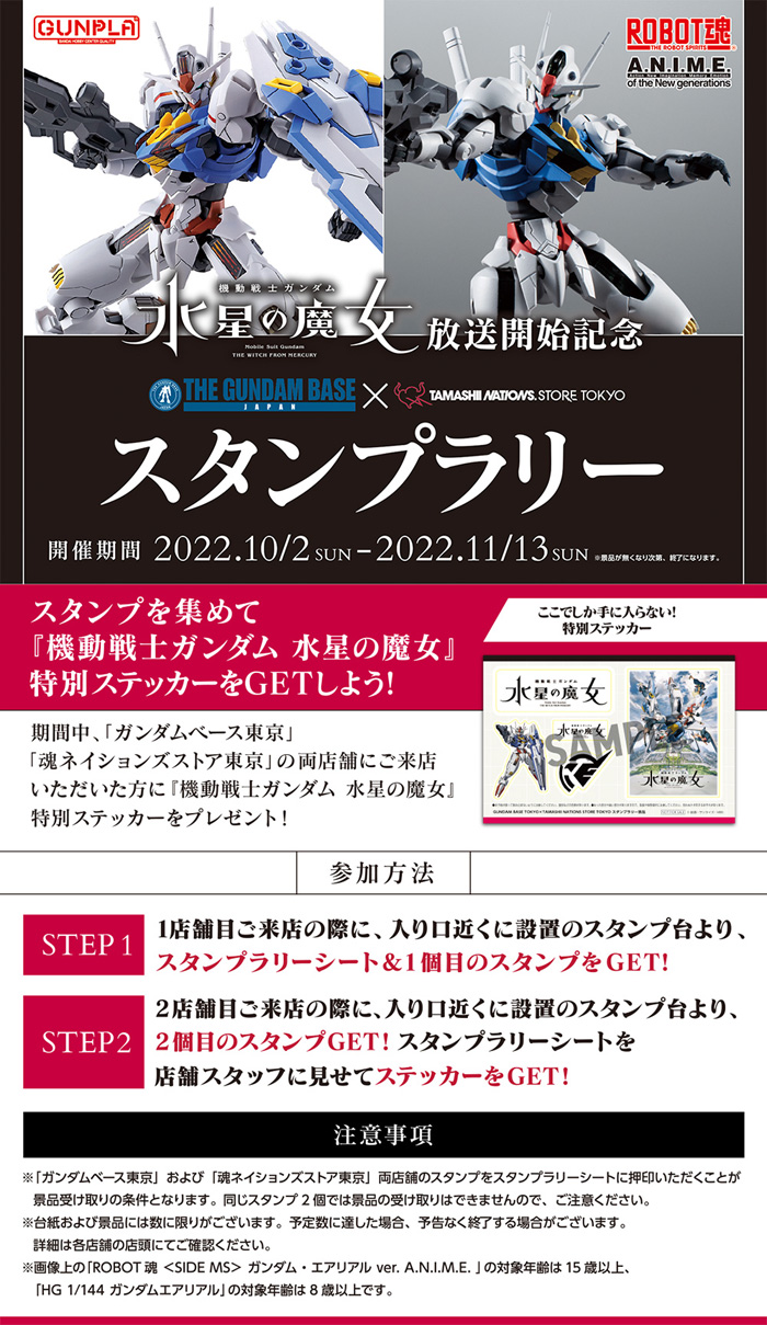 Vous pouvez recevoir unMobile suit Gundam la sorcière de mercureautocollant si vous visitez à la fois GUNDAM BASE TOKYO et TAMASHII NATIONS STORE TOKYO et recueillir des timbres des deux magasins.