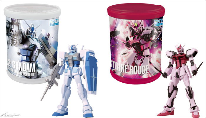 Ces articles sont des ensembles de boîtes cylindriques avec couvercles qui comprennent un kit de modèle en plastique et des collations.Le type A comprend un kit Gundam, et le type B comprend un kit Strike rouge.