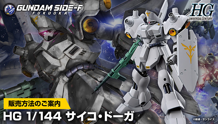 Le HG psycho doga sera en vente à GUNDAM SIDE-F à l’intérieur de Gundam Park Fukuoka, un polyvalente Gundam Entertainment Facility, le samedi, décembre 19th.Le prix est 4 180 JPY (TTC) et les candidatures sont actuellement ouvertes pour les ventes de loterie sur le site officiel de GUNDAM SIDE-F.