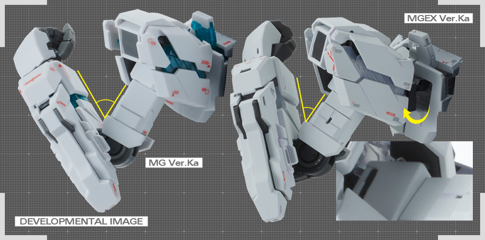 "A comparison of articulation around the arms and shoulders. The structures of the elbow joints of the MGEX have been updated to enable even further bends." The internal frames of the shoulder joints have structures that can be pulled outward to enable forward articulation.