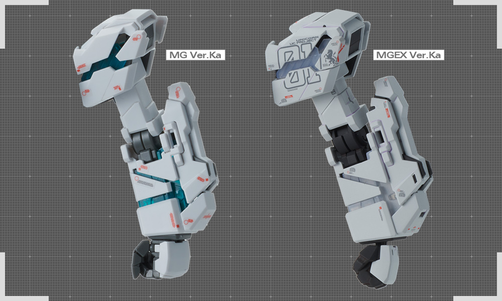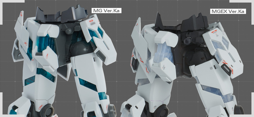 "The slight increase in size around the shoulders on the MGEX can be seen. The Psycho-Frame has been changed to a translucent milky white color and its details stand out when in Destroy Mode."