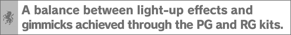 The parts on the forearms can be exchanged and the shields can be inserted, resulting in the light from the LEDs being transferred through the light-guiding parts and to the Psycho-Frame on the shields.