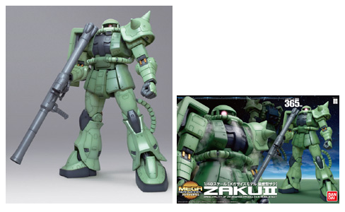 すべてのガンダムファンに捧ぐビッグモデル!メガサイズモデルより「量産型ザク」が追加装備を携えて登場!指揮官用ブレードアンテナ付き頭部パーツ付属! バックパック、脚部バーニアは量産型の通常推力装備を再現!そしてシャア専用ザクから新たに追加となる「ザク・バズーカ」と専用手首が付属!