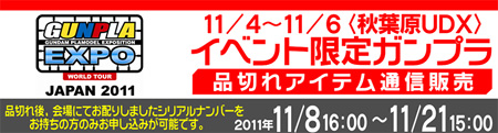 The curtains recently fell on Gunpla Expo World Tour Japan 2011, before a packed house. Several of the event-only Gunpla sold out, but they're available for order from the Premium Bandai Hobby Online Shop until 3:00 PM on November 21st.
