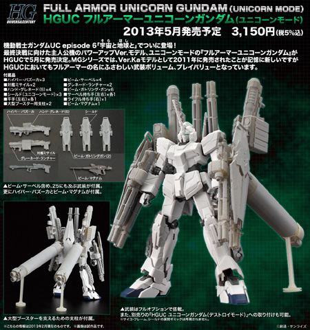 The Full Armor Unicorn, featured in Mobile Suit Gundam UC episode 6 (premiering March 2nd) as a powered-up version in preparation for the final battle, will be released as a HGUC kit in May. Its MSRP will be ¥3,150.