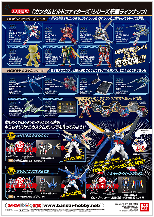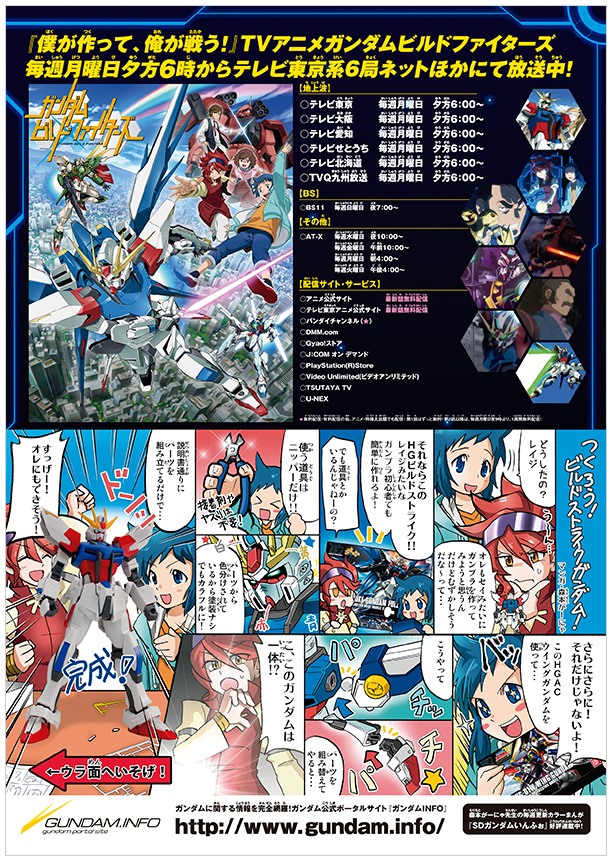 Gundam Build Fighters-themed Gunpla flyer is available at supermarkets, electronics shops, and other hobby retailers nationwide, as well as at Gundam Front Tokyo in Odaiba.