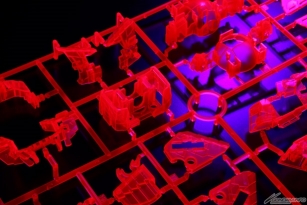 UV-reactive clear parts are used for its unique camera eye, and a tetron sticker replicates the white cross mark on its eye! The included plasma axes, one each in stowed and deployed modes, can be secured to its shield!