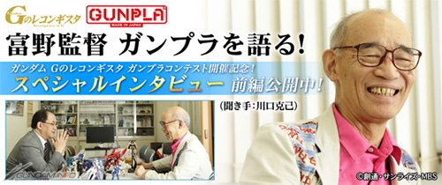 The first part of the "Director Tomino talks Gunpla!" interview conducted to promote the Gundam Reconguista in G Gunpla Contest judged by the director himself has been posted to Bandai Hobby Web.