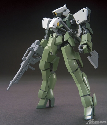 This new Mobile Suit Gundam: Iron-Blooded Orphans kit features the Graze's revised head and torso. Its back-mounter vernier nozzles can angle up and down, and its standard loadout of rifle and battle axe are included; the axe can be stowed at its hip.
