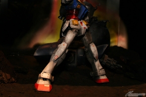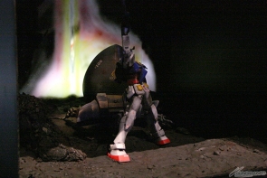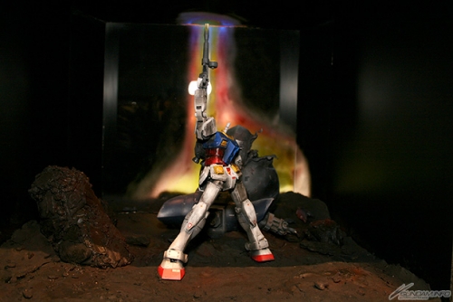 "The expression of depth, and the contrast of the white Gundam in the darkness, bring together the piece. The fine details, including the posing, make it a very well-put-together work." (Yasunaga, Bandai Hobby)