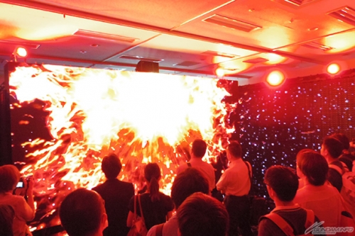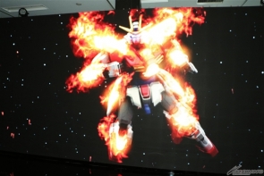 ▲プラフスキー粒子が舞い上がる迫力のLEDルームでは、トライバーニングガンダムが登場!