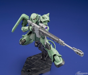 「HG 1/144 MS-06C ザクII C型/C-5型」は、2つの型から好きな方を選べる選択式組み立てとなっており、「C型」と「C-5型」の細かな形状の違いを忠実に再現。さらに、劇中で使用するものを含めた様々な武器が付属する。