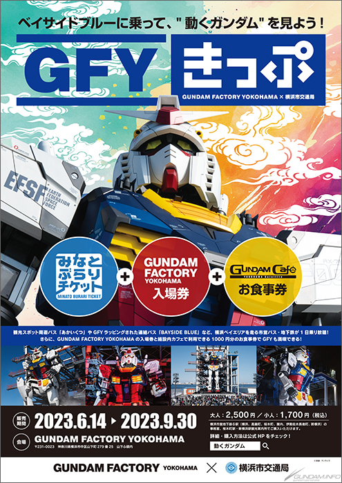 Le billet GFY est un ensemble qui est livré avec un billet de Minato Burari qui offre une journée de promenades illimitées sur le transport municipal et des services spéciaux qui peuvent être utilisés à environ 80 installations/magasins affiliés, un billet d’entrée à GUNDAM FACTORY YOKOHAMA, et un ticket de repas pour GUNDAM café.Les billets adultes coûtent 2 500 JPY (taxes incluses) et les billets pour enfants coûtent 1 700 JPY (taxes incluses).des trajets illimités sur le transport municipal et les services spéciaux qui peuvent être utilisés à