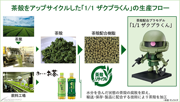 Upcycling des feuilles de thé usagées de la production d’Oi Ocha ! 1/1 Zakupla-kun, un gunpla contenant des feuilles de thé usagées, est là !