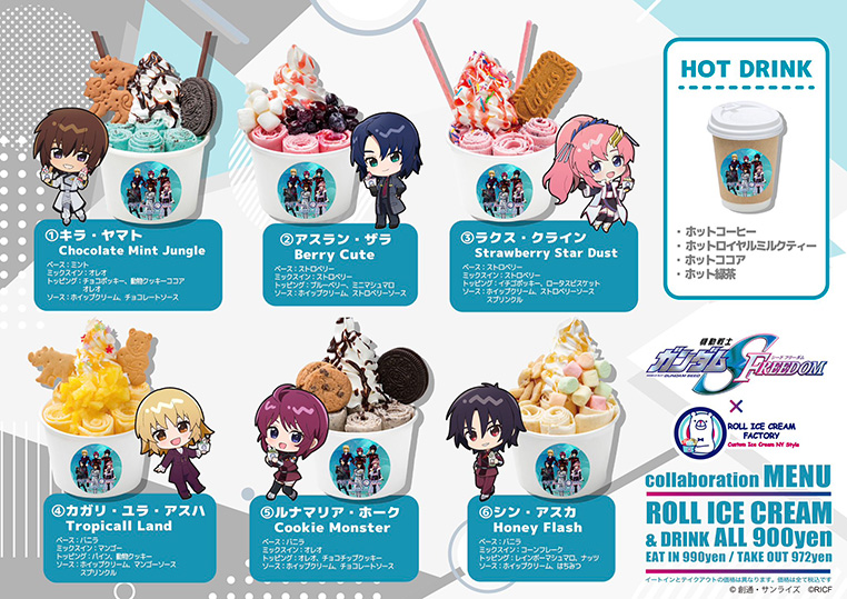 Au cours de cette période d’événement, six glaces roulées originales et des boissons à l’image de personnages comme Kira et Athrun seront vendues dans les établissements participants.Chaque crème glacée sera servie dans une tasse originale avec le design du personnage dessus.
