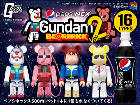 During the promotion, each half-litter bottle of Pepsi NEX will come with one of the 16 following 'Pepsi NEX Mobile Suit Gundam BE@RBRICK Vol.2' figures.