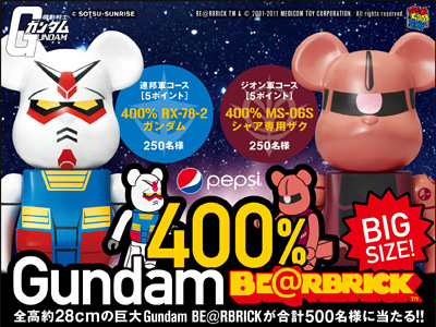 Plus, gather Pepsi Marks and enter to be one of 250 winners of either a 28cm-high huge Gundam BE@RBRICK '400% RX-78-2 Gundam' or a '400% Char Customize ZAKU', beginning May 24th! Drink Pepsi, and collect both normal and huge Gundam BE@RBRICKs!