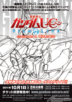 Gundam Live Entertainment's Mobile Suit Gundam UC Film & Live Episode 4 Premiere will be held in Shibuya C.C. Lemon Hall (formerly Shibuya Public Hall) October 1st. Flyers for the event are currently being distributed at Akihabara's Gundam Café and Tamashii Nations Akiba Showroom.