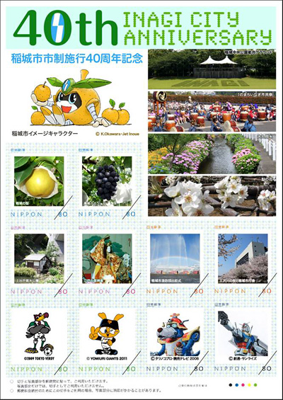 A limited edition of 1,500 stamp books featuring characters from Ogawara works such as Gundam and Yatterman, as well as Inagi City landscapes and produce, will be sold at Inagi City post offices.