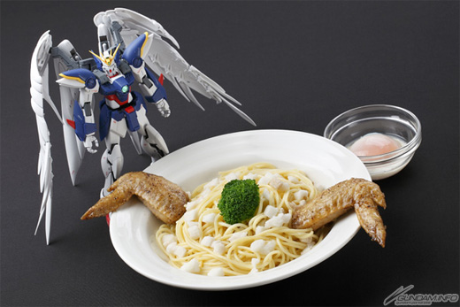 A yam, chicken, and shio-koji pasta based on the Wing Gundam Zero Custom from Mobile Suit Gundam Wing. Crack the "self-destruct switch" (egg) over it to enjoy an ersatz Japanese carbonara.