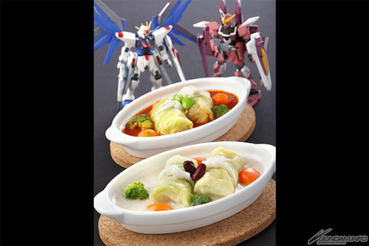 A Mobile Suit Gundam SEED-themed mild cabbage roll with minced chicken. Kira's version includes a mild white sauce made with fresh cream, while Athrun's is made with tomato sauce. We recommend pairing this dish with Lacus or Cagalli sides.