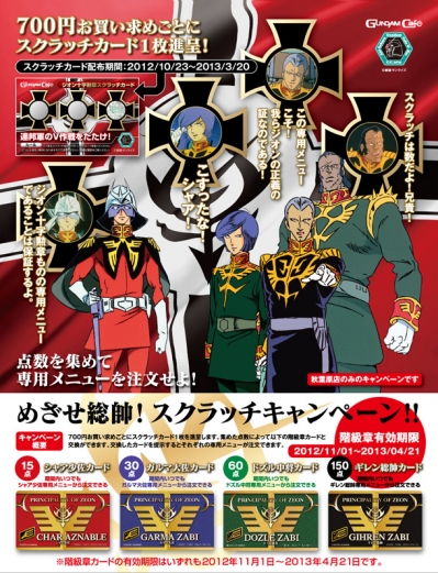 「階級章カード」は「シャア少佐カード」、「ガルマ大佐カード」、「ドズル中将カード」、「ギレン総帥カード」の4種で、注文の際に提示することで限定メニューを注文することができる。