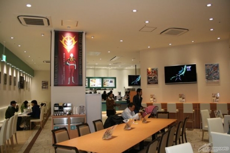 Inside, it's packed with both monitors displaying famous Zeon scenes and classy artwork. The menu features both Gundam Café favorites like Jaburo coffee and Haro lattes, and exclusives you won't fine anywhere else!