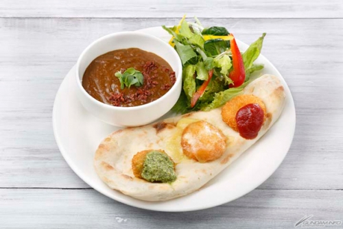 ふっくらもちもち食感のナンとごはんのカレープレート!3つの風味のクリームコロッケも!