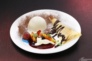 ■ A creamy layered cheesecake takes the shape of a full moon. Stacked crepes are layered like memories. Garnished with fruit.