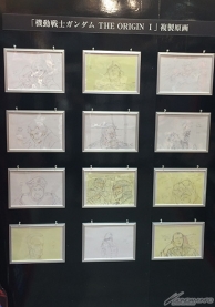 The shop features wall art including Char's Zaku and a life-sized Char Aznable himself, along with repro animation lineart and samples of Yoshikazu Yasuhiko's manuscripts for the comics and cover.
