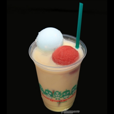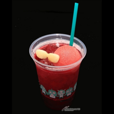 Meijin Kawaguchi's mobile suit. This bittersweet mixed berry juice is topped with berry ice cream. Includes an apple slice cut in the shape of sunglasses.